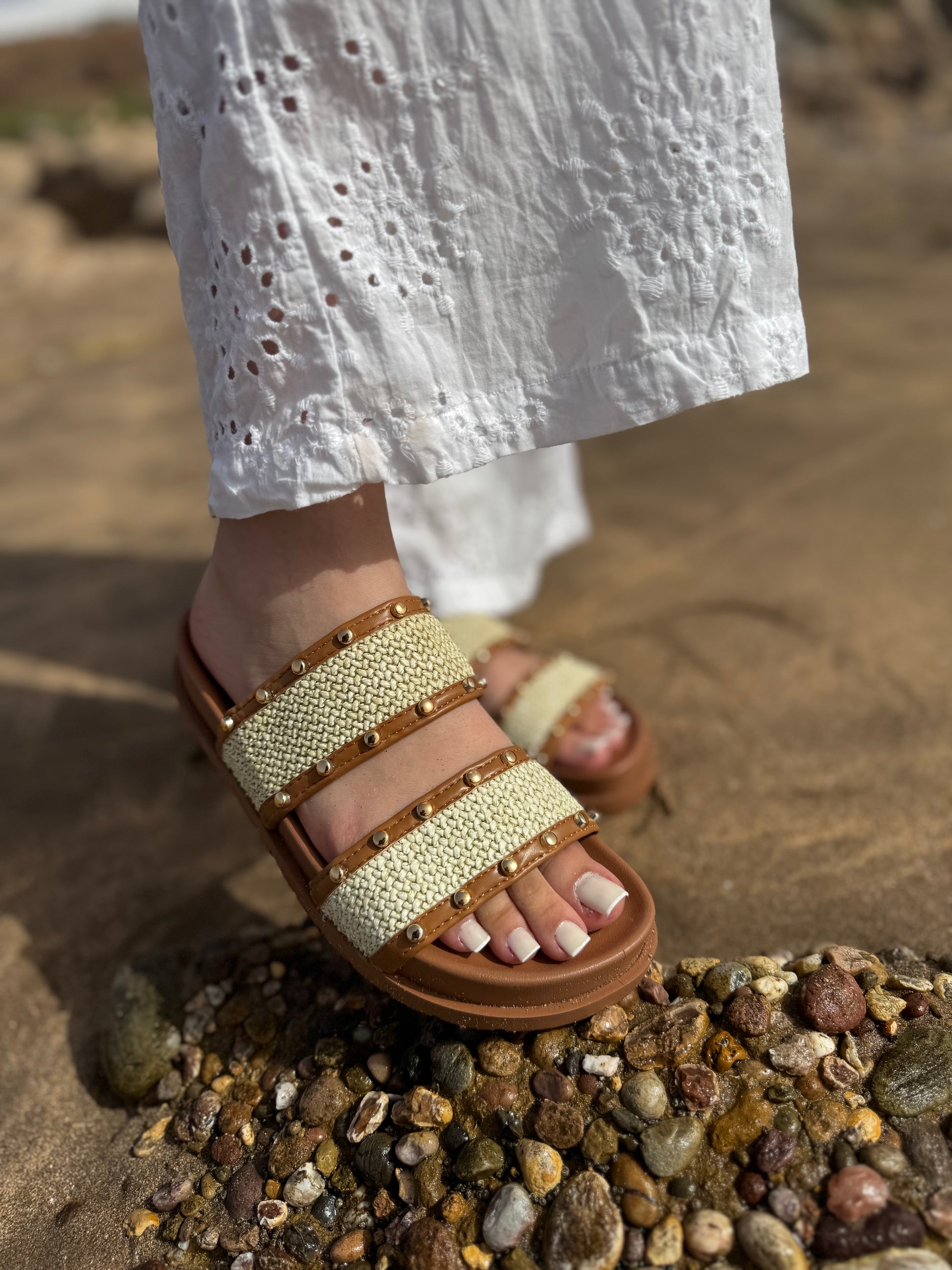 Avec ses trois brides tressées ornées de clous dorés, elle allie confort et style bohème pour sublimer vos pas en toute légèreté.